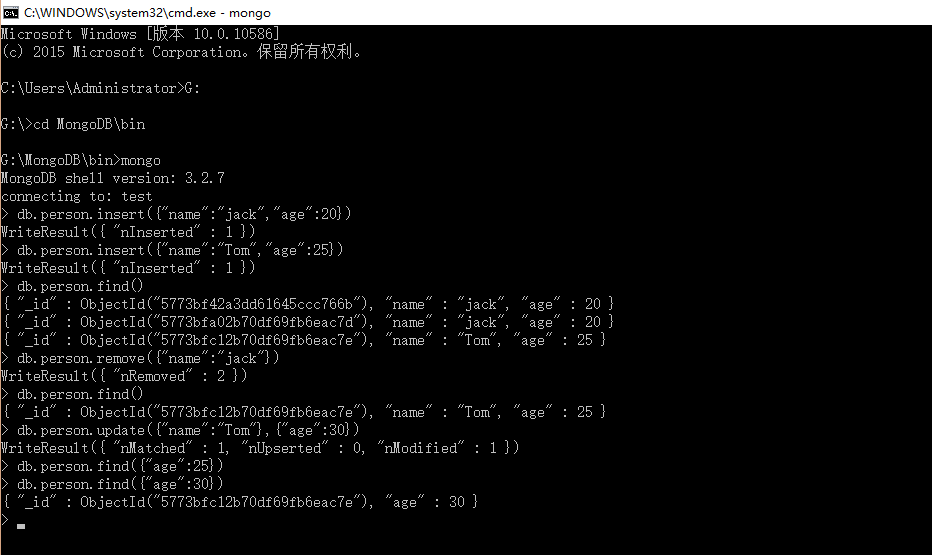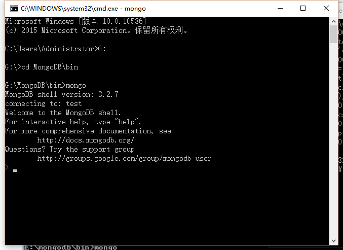 再开一个cmd,输入mongo命令打开shell,其实这个shell就是mongodb的客户端,同时也是一个js的编译器,默认连接的是“test”数据库。