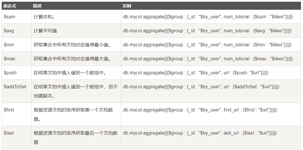 表达式:处理输入文档并输出。表达式是无状态的,只能用于计算当前聚合管道的文档,不能处理其它的文档。