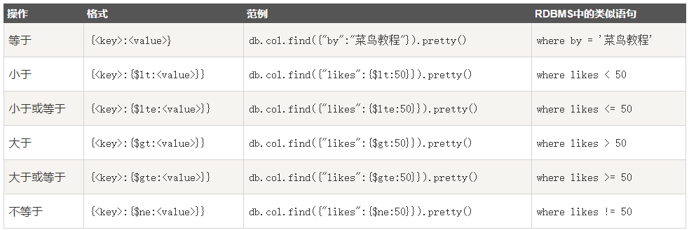 以上实例中类似于 WHERE 语句:WHERE by='菜鸟教程' AND title='MongoDB 教程'