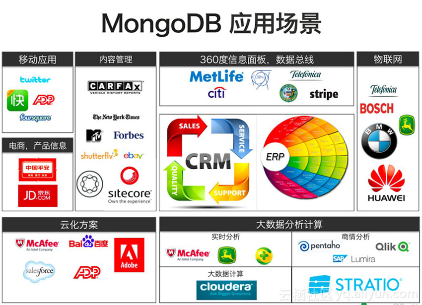 - 社交场景,使用 MongoDB 存储存储用户信息,以及用户发表的朋友圈信息,通过地理位置索引实现附近的人、地点等功能