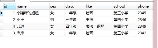 VALUES (‘1’, ‘大猫’, ‘女’, ‘一年级’, ‘绘画’, ‘第三小学’, ‘2345’);
