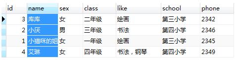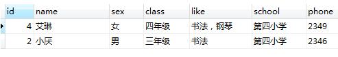 VALUES (‘4’, ‘艾琳’, ‘女’, ‘四年级’, ‘书法,钢琴’, ‘第四小学’, ‘2349’);