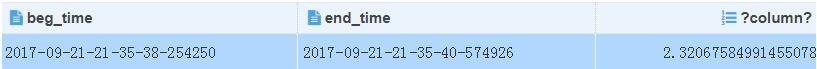 select beg_time, end_time, extract(epoch from to_timestamp(end_time,’yyyy-mm-dd-HH24-MI-SS-US’))-extract(epoch from to_timestamp(beg_time,’yyyy-mm-dd-HH24-MI-SS-US’)) from cdb_all_iu_data where beg_time > ‘2017-09-21’