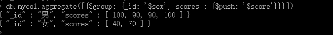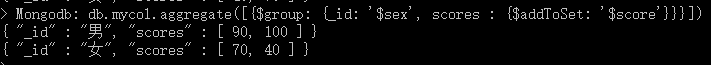 db.mycol.aggregate([{$group: {_id: '$sex', scores : {$addToSet: '$score'}}}])