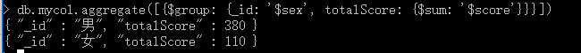 MongoDb: db.mycol.aggregate([{$group: {_id: '$sex', totalScore: {$sum: '$score'}}}])