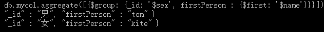 db.mycol.aggregate([{$group: {_id: '$sex', firstPerson : {$first: '$name'}}}])