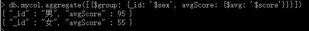 Mongodb: db.mycol.aggregate([{$group: {_id: '$sex', avgScore: {$avg: '$score'}}}])