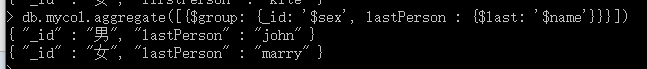 db.mycol.aggregate([{$group: {_id: '$sex', lastPerson : {$last: '$name'}}}])