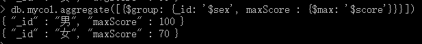 Mongodb: db.mycol.aggregate([{$group: {_id: '$sex', maxScore: {$max: '$score'}}}])