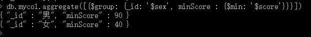 Mongodb: db.mycol.aggregate([{$group: {_id: '$sex', minScore: {$min: '$score'}}}])