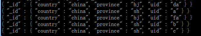 db.t2.aggregate([ { $group: {"_id": { "country" : "$country", "province": "$province" , "uid" : "$userid" } } } ])