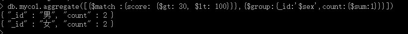 db.mycol.aggregate([{$match :{score: {$gt: 30, $lt: 100}}},{$group:{_id:'$sex',count:{$sum:1}}}])