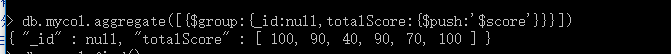 db.mycol.aggregate([{$group:{_id:null,totalScore:{$push:'$score'}}}])