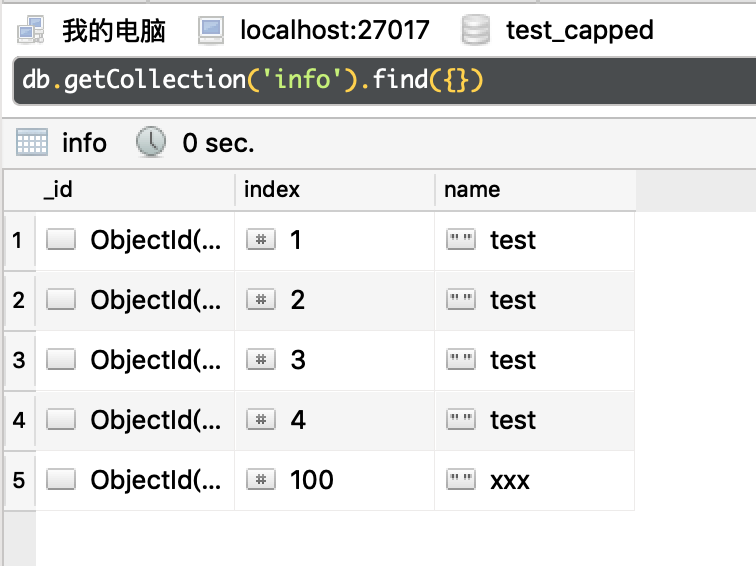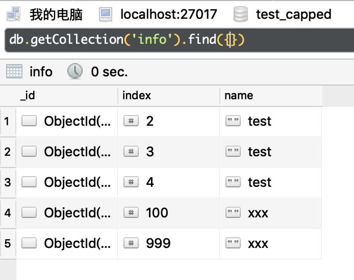 创建好以后,capped collection的插入操作和查询操作就和普通的集合完全一样了: