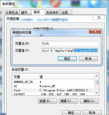 我的电脑–属性–高级系统设置–环境变量–系统变量,找到PATH,双击编辑,在末尾加上;D:\MongoDB,注意前面加分号,最后点击确定即可。如图: