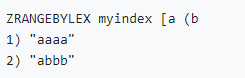 puts “ZRANGEBYLEX myindex [#{s} [#{e}”