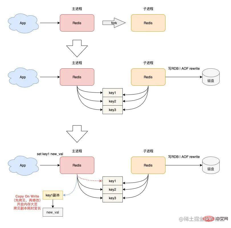 - 当 Redis 在执行后台 RDB 和 AOF rewrite 时,采用 fork 子进程的方式来处理。但主进程 fork 子进程后,此时的主进程依旧是可以接收写请求的,而进来的写请求,会采用 Copy On Write(写时复制)的方式操作内存数据。