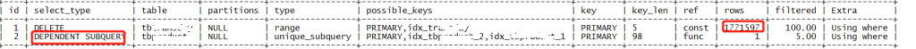 子查询的类型是DEPENDENT SUBQUERY,表示这个查询是子查询的第一个查询,外部的查询会反复去进行这个操作。即在这条语句中,外部查询结果集(数据量为1771579)的每一条结果都将执行一次子查询,进行1771597次匹配,若数据量较大的情况,即使加了索引也会使效率低下。