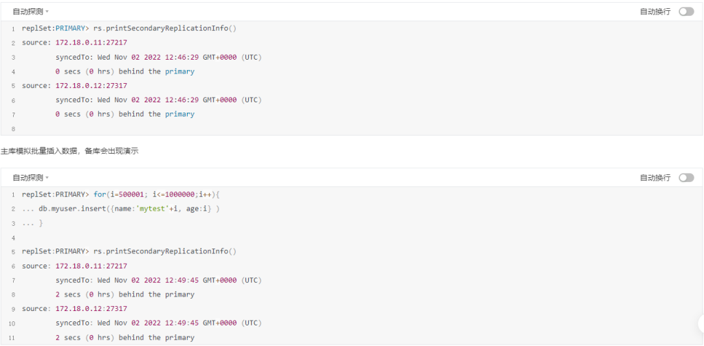 replSet:PRIMARY> rs.printSecondaryReplicationInfo()