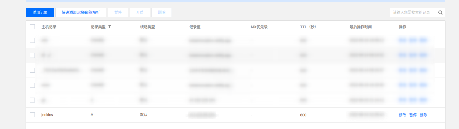 这里设置的jenkins是域名的前缀,可以以此来区分不同的服务。记录值中填写服务器的公网IP。