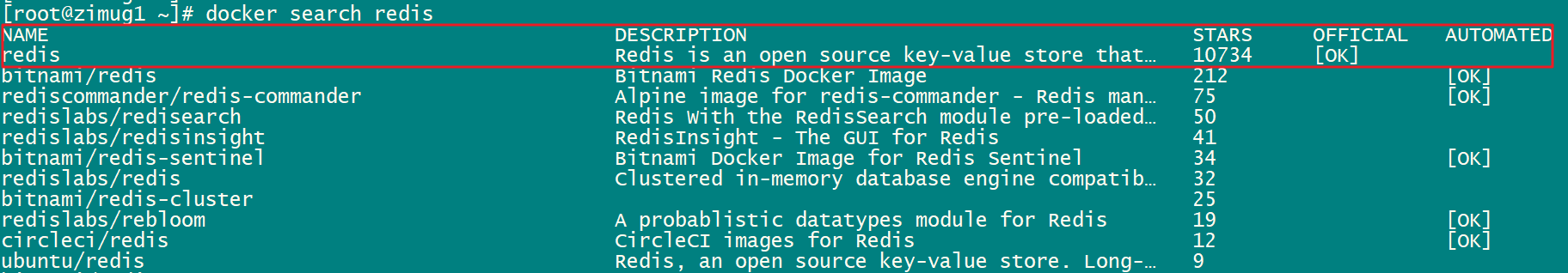 - 第一种方式就是在Dcoker hub上直接搜索镜像,比如我搜索redis镜像,下方出现绿色盾牌标志的就是redis官方提供的镜像,安全性稳定性都是有保证的。