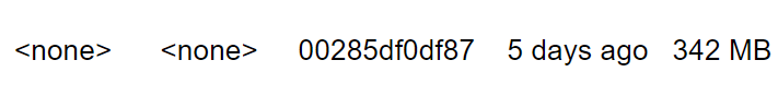 在镜像列表中,可能会存在一种特殊的镜像,该镜像既没有仓库名/镜像名称,也没有标签/版本号,这两个位置均显示 <none> ,这种镜像通常被称为 虚悬镜像 ,如下入所示。