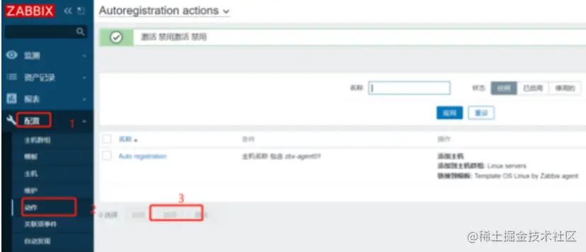 点击左边菜单栏【配置】中的【动作】,勾选自动注册规则,点击 禁用
