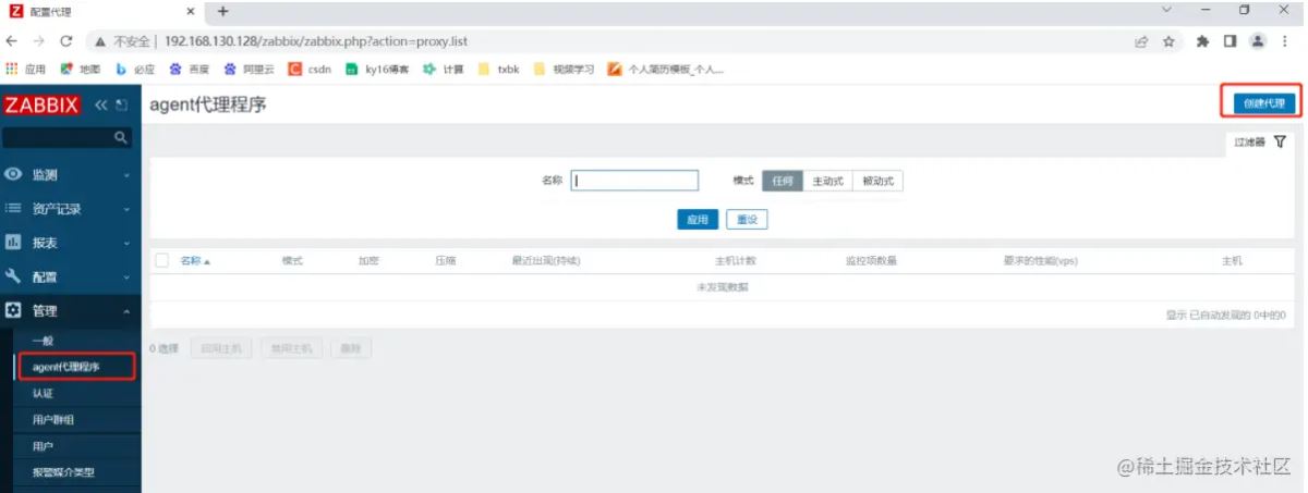 点击左边菜单栏【管理】中的【agent代理程序】,点击【创建代理】