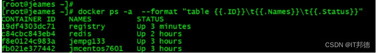 docker ps -a –format “table {{.ID}}\t{{.Names}}\t{{.Status}}”