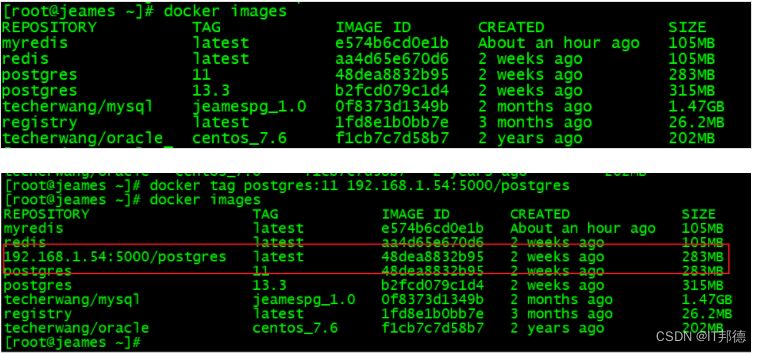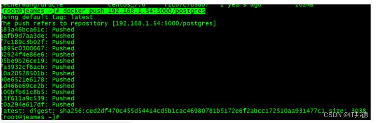 [root@jeames ~]# docker tag postgres:11 192.168.1.54:5000/postgres