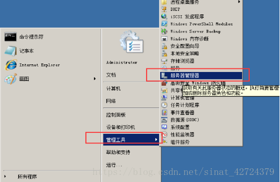 3. 打开服务器管理器:系统中点击 “开始菜单程序”——> 管理工具 ——>服务器管理器