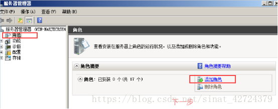 4. 进入服务器管理器,点击左侧的“角色”然后点击右侧“添加角色”