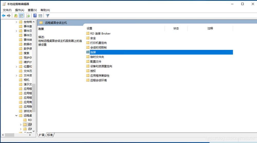 依次点击展开“计算机配置>>>管理模板>>>Windows 组件>>>远程桌面服务>>>远程桌面会话主机>>>连接”