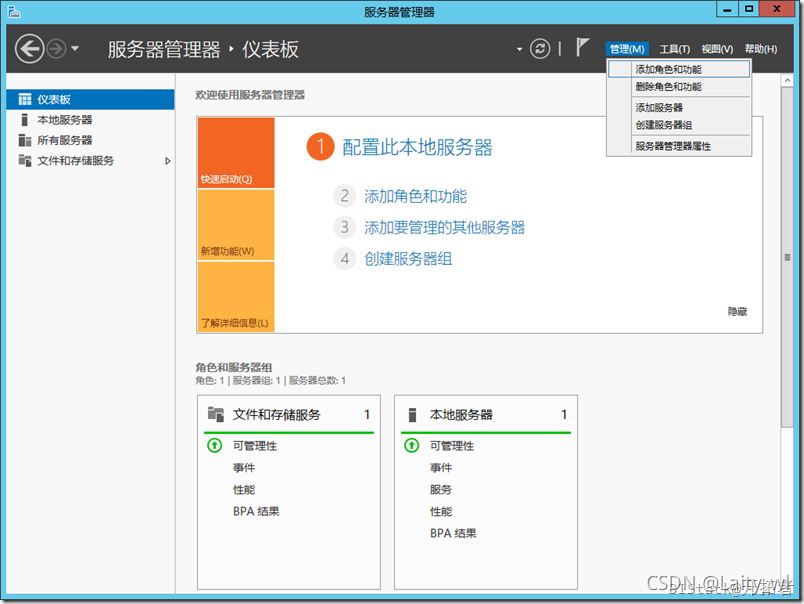 打开服务器管理器,点击管理菜单,选择【添加角色和功能】,并按照如下步骤执行即可。
