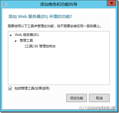 在勾选【Web服务器(IIS)】选项时候,可能会弹出如下类似的需要添加其它角色和功能的确认框,点击【添加功能】即可。