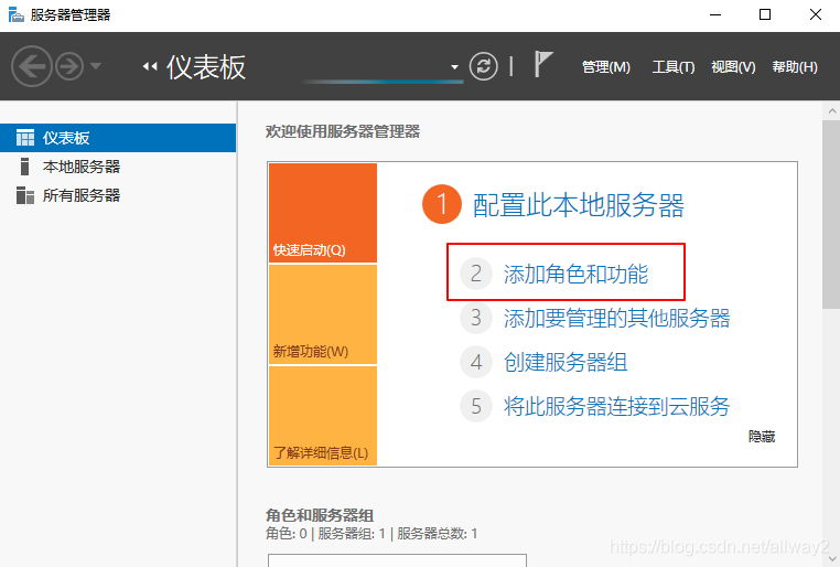 (1)打开服务器管理器,添加角色和功能。