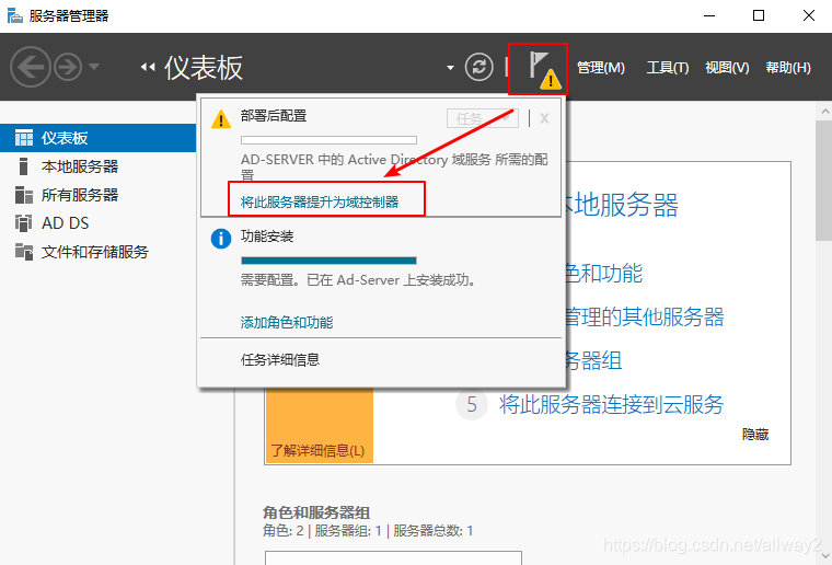 (1)点击服务器管理器左侧“AD DS” 、点击黄色提示部分中的更多。
