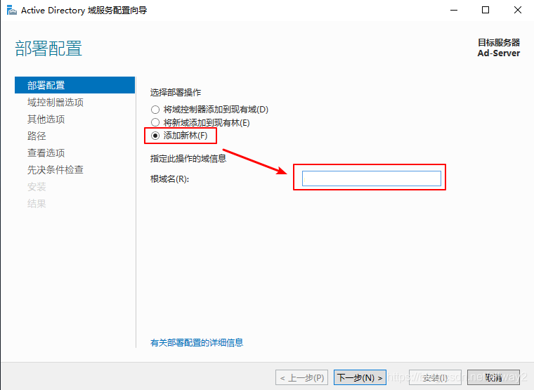 (3)进入AD域服务器配置向导,选择 “添加新林” ,输入域,点击下一步。