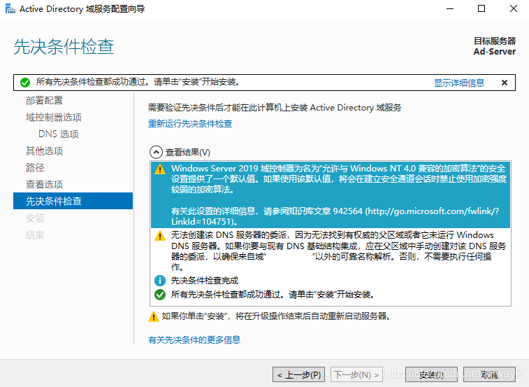 (8)点击安装 。此过程可能会报错,提示登陆用户没有设置密码,去设置给当前登陆用户(Administrator)设置一个密码,然后回来点击 “重新运行先决条件检查” 即可!