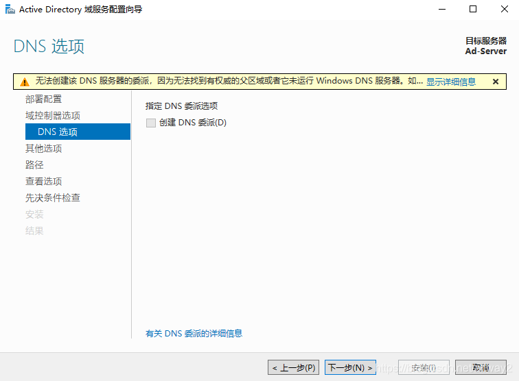 (5) 出现关于DNS的警告,因为目前还没有安装DNS,所以不用理会,直接选择下一步,如图。