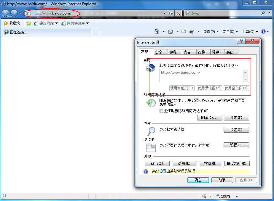 首先点“启用”然后在下面的主页处添加主页网址,这里以百度为例,这样最终实现的目的即在client端,使用行政部门下的账户“popo”登录以后,打开浏览器的默认打开的第一个网页就是百度,而且“popo”用户没有权限来进行主页的修改。