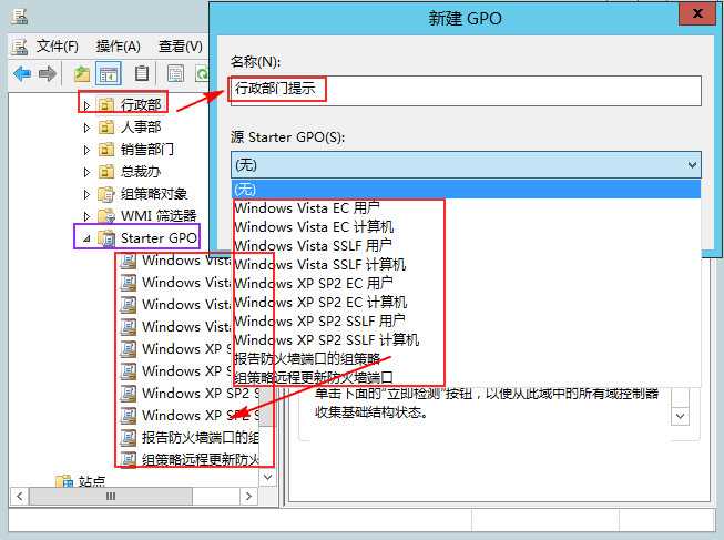 在名称里面填写要创建的组策略的名称,而在源这里可以选择“无”进行自己自定义的组策略配置,或者选择下拉列表中已经是系统默认新建好的模版策略,而这些模版策略都存放在“StarterGPO”下面,如果方便的话,建议可以直接在“StarterGPO”下面建立配置模版,然后在组织OU下面调用就可以了,这样不用每次需要重复查找配置策略。