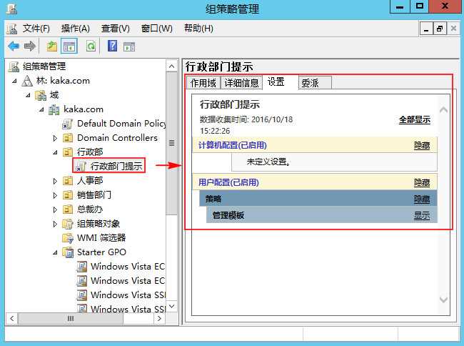 4.这样在行政部的OU下面就会有一条组策略的记录刚建立好的,而在设置里面可以看到当前都配置的条目,点击右边的显示可以逐条向下显示: