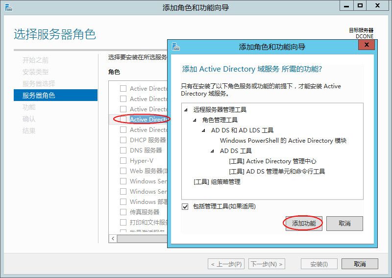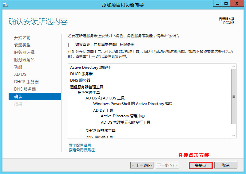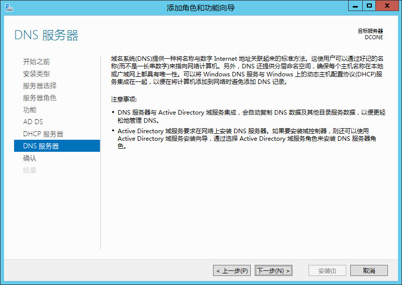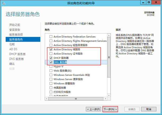 3.首先开始第一台服务器的AD+DHCP+DNS的搭建,因为在添加服务器角色的时候,可以同时选取,所以三项可以同时选取并进行安装。