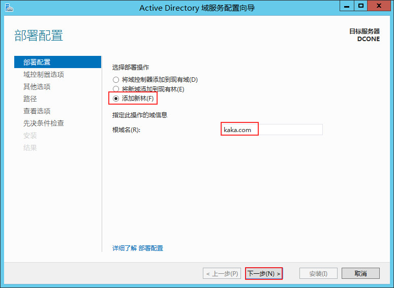 之前已经知道主DCONE已经提升自己成为了域控制器,现在要将DCTWO跟DCONE关联成冗余关系,那么也是通过提升域控制器的选项来进行的,不同的是加入到现有域,而不是直接通过计算机的高级设置加入域,这里要特别注意了: