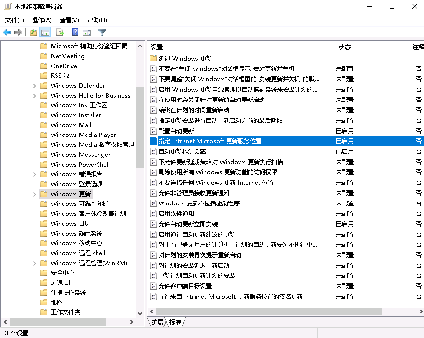 右键开始菜单图标,选择“运行”,然后输入gpedit.msc,依次选择 “计算机配置” – “管理模板” – “Windows 组件” – “Windows 更新”,双击“指定 Intranet Microsoft 更新服务位置”: