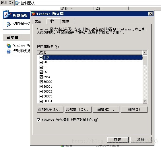 点击”例外”选项卡可以看到服务器上已添加的开放端口,点击添加端口。