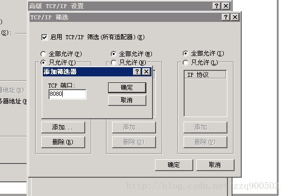 在TCP/IP筛选的弹出框中,添加TCP协议的端口。例如添加8080,然后点击确定。