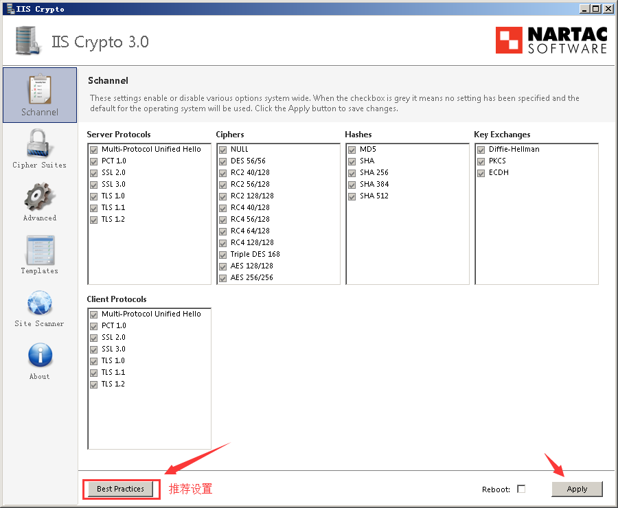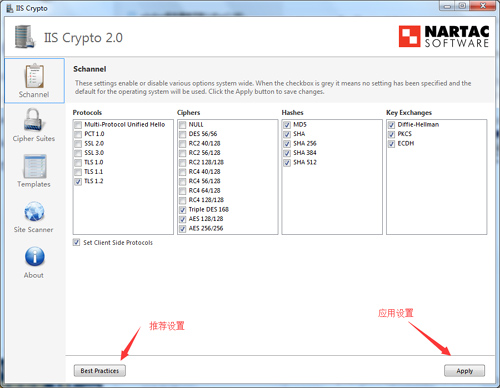 对于Windows Server服务器来说,通过修改注册表可以完成SSL安全配置,此外,还有一个简单的自动配置工具IISCrypto,下载该工具后,使用推荐配置即可完成安全设置,使用起来非常简单。