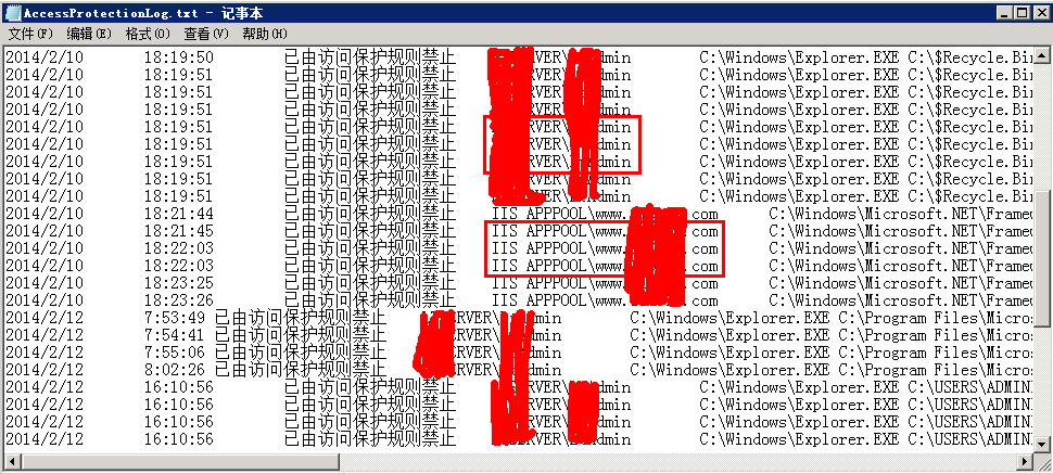 从日志这里,你可以看到是什么用户在操作的,运行的是那个程序,做什么操作的时候给阻止的。一般来说我们服务器是做网站用的,如果这里禁用的是SYSTEM或IIS的相关帐号,那么认真看看这些程序是不是网站运行必须的,是的话就放行,不是的就不用理它。而管理员帐号的操作,如果是自己操作时产生的,就临时放行一下就可以了,如果不是的话,就要查查是不是可能给入侵了。
